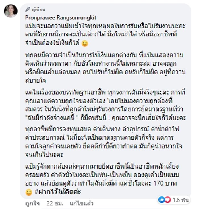 ทุกคนมีความจำเป็นในการใช้เงินแตกต่างกัน ที่แป๋มแสดงความคิดเห็นว่าเรทราคา กับชั่วโมงทำงานนี้ไม่เหมาะสม อาจจะถูกหรือผิดแล้วแต่คนมอง คนไม่รับก็ไม่ผิด คนรับก็ไม่ผิด อยู่ที่ความสบายใจ