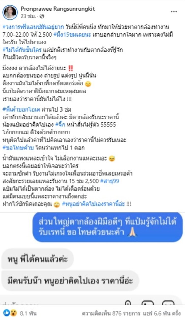 ผู้โพสต์ ระบุว่า “#วงการฟรีแลนซ์มันอยู่ยาก วันนี้มีพี่คนนึง ทักมาให้ช่วยหาตากล้องทำงาน 7.00-22.00 ให้ 2,500 #มึง15ชมเลยนะ เราบอกลำบากใจมาก เพราะคงไม่มีใครรับ ให้ไปหาเอง #ไม่ได้กันซีนใคร แต่ปกติเราทำงานกับตากล้องที่รู้จัก ก็ไม่มีใครรับราคานี้จริงๆ”
